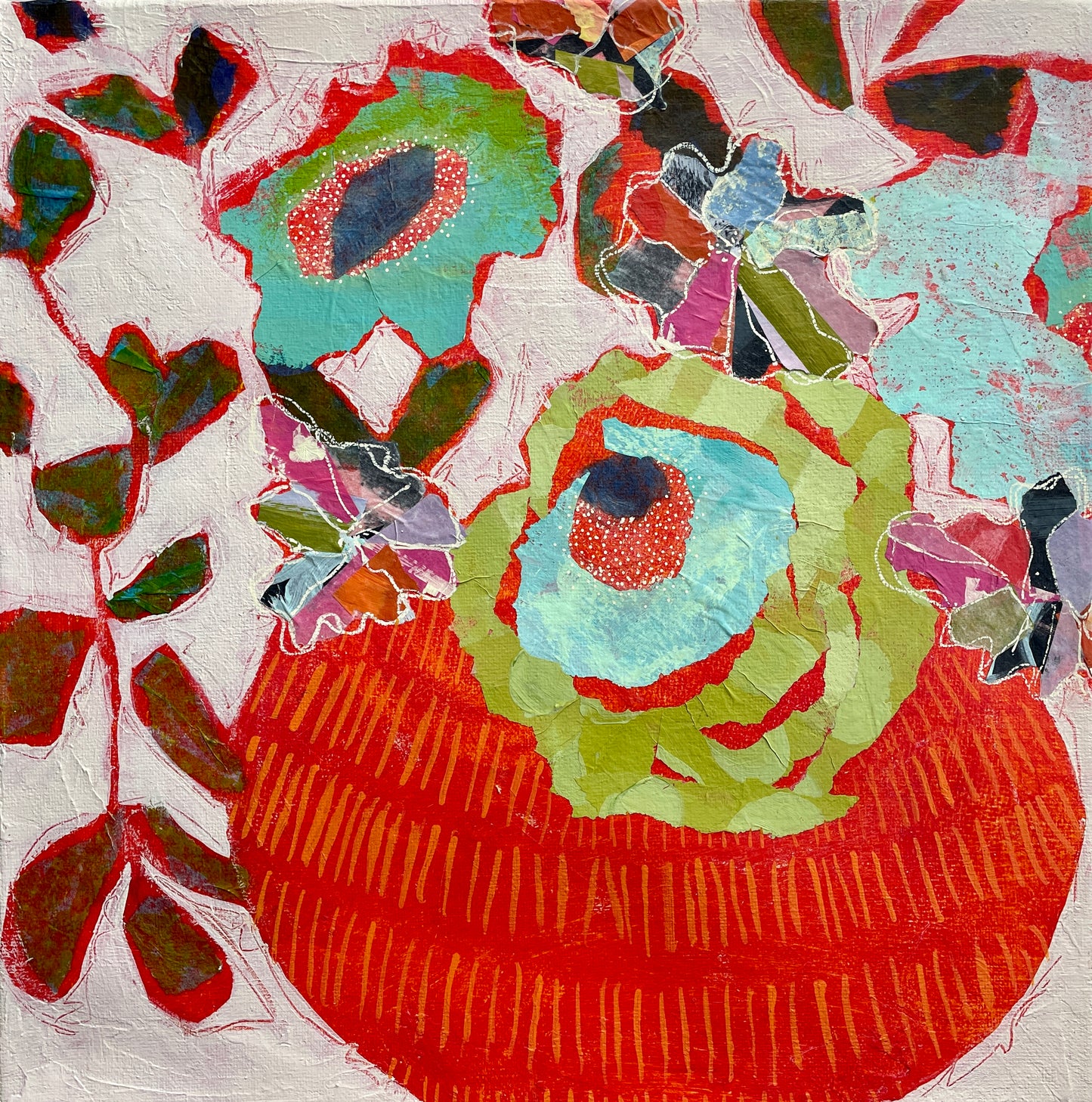 This 12"x 12" This mixed media, painted paper collage and acrylic painting on a 1 1/2" depth canvas is an abstract floral piece to brighten up a small spot in your home. It was created with joy and a love of colour and texture.