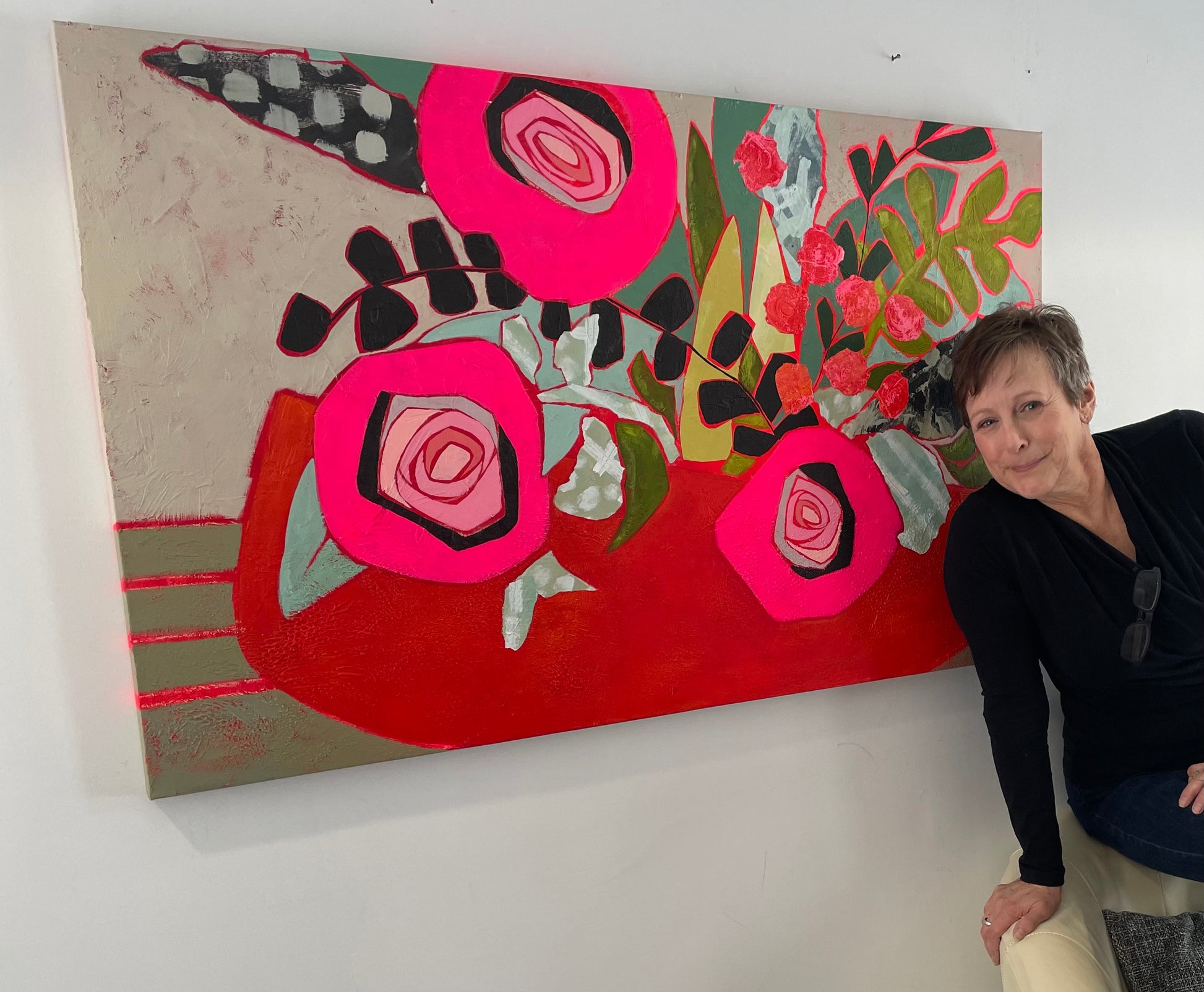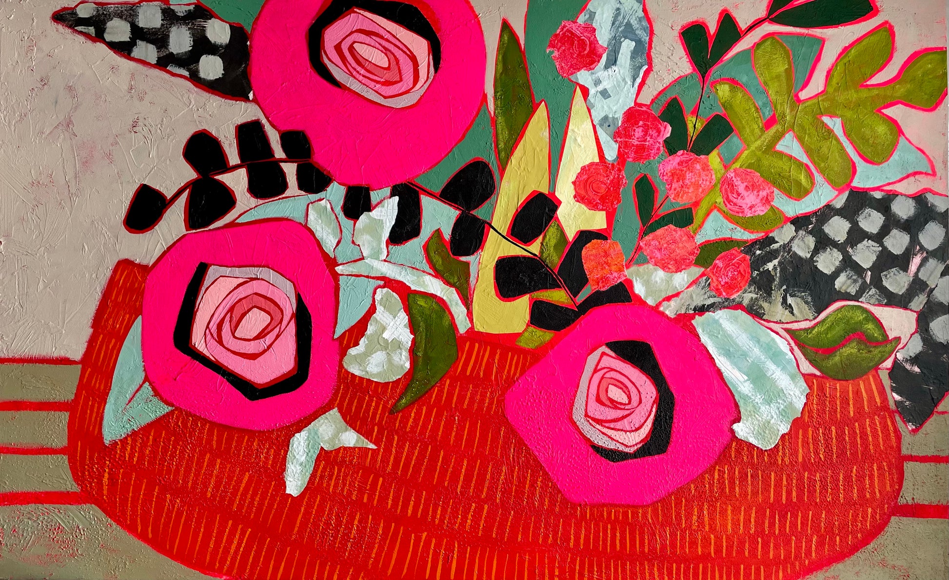 "Celebrate Big Time" A statement art painting on a 1 1/2" depth canvas, acrylic paint and painted papers. A modern and energetic exploration of a floral still life. A statement art piece to brighten your home.