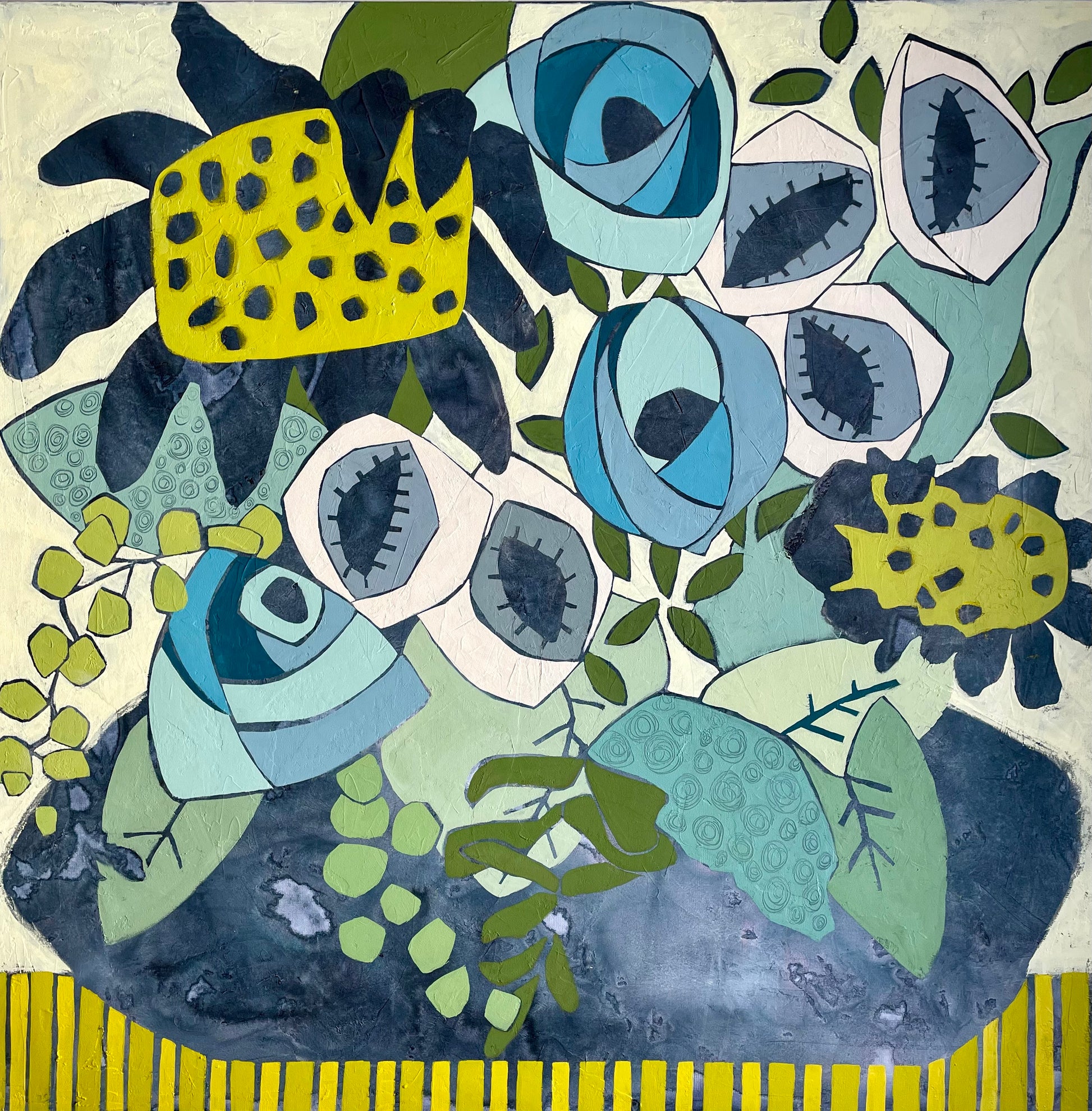 "True Blue" A statement art painting on a 1 1/2" depth canvas, acrylic paint. A modern and energetic exploration of a floral still life. A statement art piece to brighten your home, it will draw your guests attention and enhance your home decor